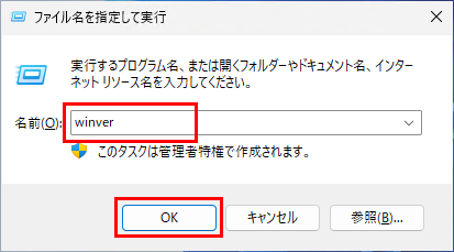 2. 「winver」と入力して、「OK」ボタンをクリックします。