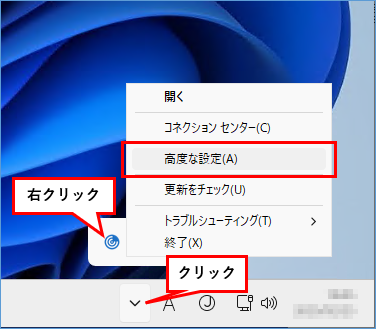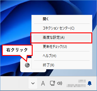 11. タスクトレイ(画面右下の ▽ をクリック)の青いアイコンを右クリックして、「高度な設定」を選択します。