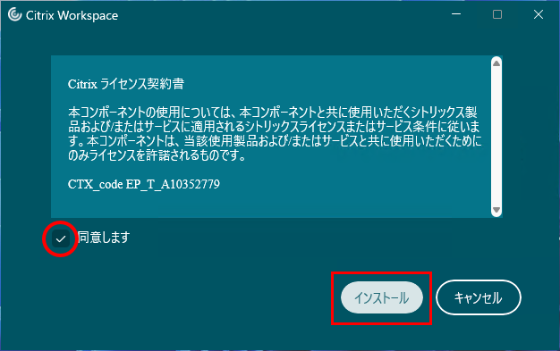 7. 下記の画面が表示されます。「同意します」のチェックを入れて「インストール」ボタンをクリックします。