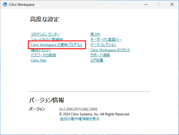 12. 下記の画面表示されます。「Citrix Workspace の更新プログラム」をクリックします。