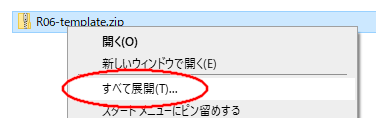 3. ダウンロードしたファイル(R06-template.zip)を右クリックして、「すべて展開」をクリックします。
