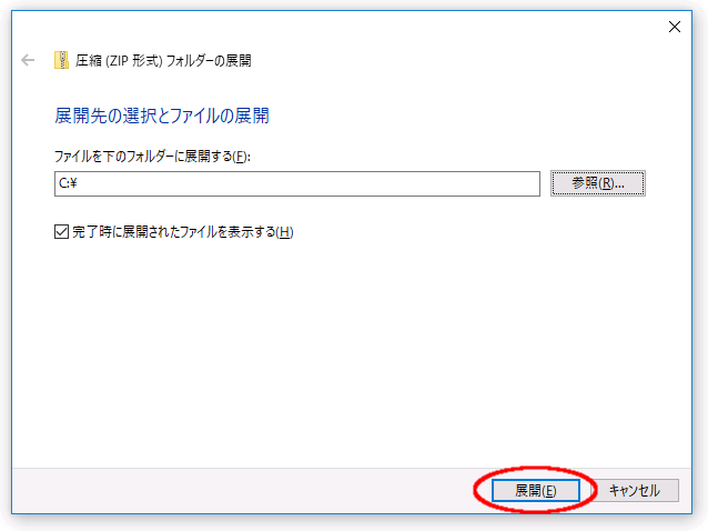 4. 下記画面が表示されます。展開先のフォルダーを「C:\」として、「展開」ボタンをクリックします。