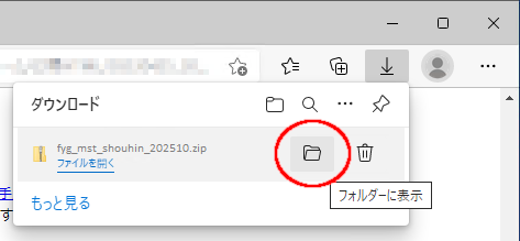 1. こちら をクリックしてテンプレートファイル(fyg_mst_shouhin_202510.zip)をダウンロードします。 ※ 下記画面が表示されます。「フォルダーに表示」のアイコンをクリックします。
