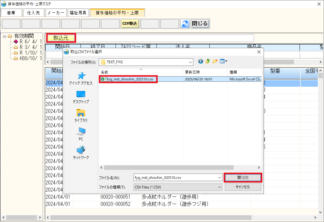 [貸与価格の平均・上限マスタ]は、以下の画面のいずれかにて[マスタ他]ボタン →[マスタ]ボタンをクリックすると表示することができます。 ・[ケアマネ]→[利用・提供票]→[利用票]画面 ・[利用状況]→[用具入出庫]→[入庫処理]、[出庫処理]画面 ・[利用状況]→[提供票]画面 ・[請求]→[算定]→[提供票]画面 ・[個別計画]→[福祉用具計画書]→[ふくせん選定提案]、[ふくせん利用計画]、 [ふくせんモニタリング]→[用具]ボタン →[福祉用具検索・選択]画面 [貸与価格の平均・上限マスタ]の取り込み手順について、ご案内いたします。 1. [貸与価格の平均・上限マスタ]画面を表示し、有効期間「R 6/ 4/ 1」を選択後に、[取込元]ボタンをクリックします。