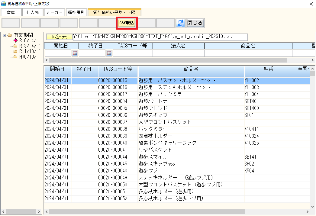 [福祉用具マスタ]画面においても同様に、[CSV取込]ボタンより取り込むことができます。 | ||